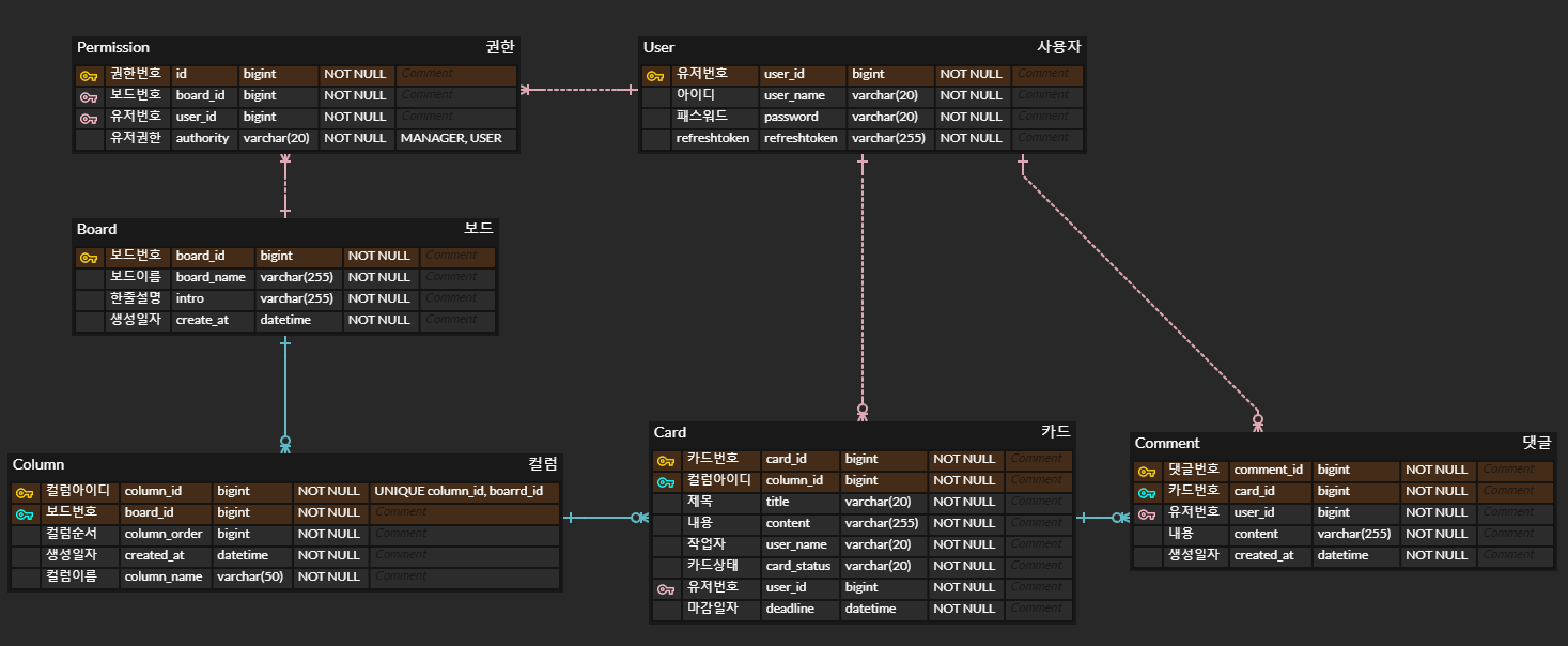 Comment 테이블 또한, Card와 1:N관계를 가지고 있으며, 이는 하나의 카드에 여러개의 유저들이 댓글을 달 수 있는 관계이며, 댓글을 작성한 유저의 정보를 알아야 하기에 User테이블과 1:N 관계를 맺어주었다.