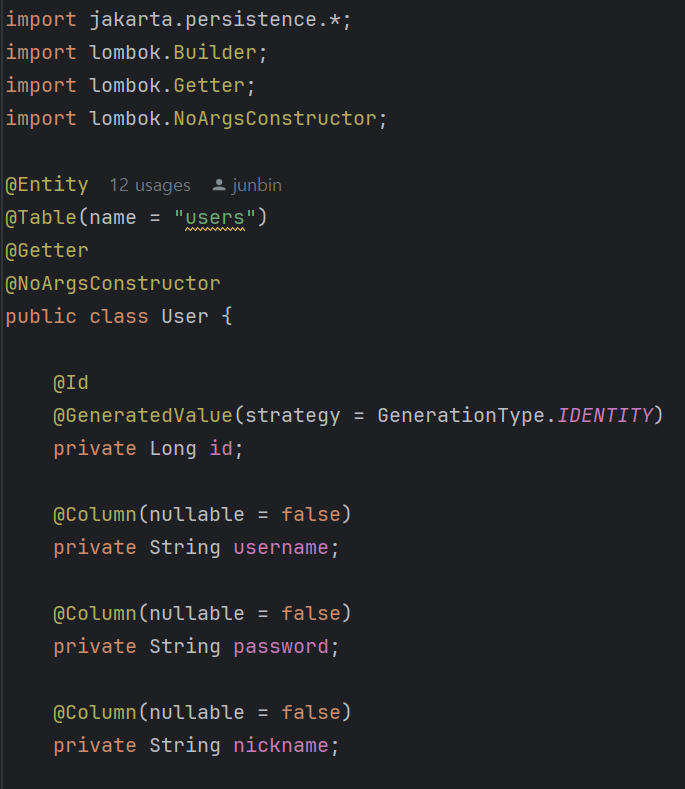 ๊ฒฐ๊ตญ JPA Entity ํด๋์ค์์ Builderํจํด์ ์ฌ์ฉํ๋ ค๋ฉด ๊ธฐ๋ณธ์์ฑ์๋ฅผ ๋ฃ์ด์ผํ๋ค.