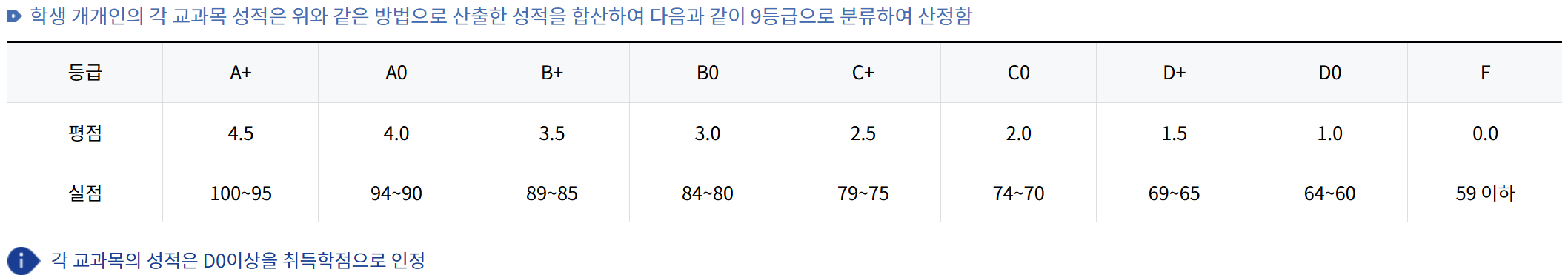 * ๊ต๊ณผ๋ชฉ๋น ์ฑ์ ์ D0 ์ด์์ผ ๊ฒฝ์ฐ์๋ง ์ทจ๋ํ์ ์ผ๋ก ์ธ์ ์ ํด์ฃผ๊ณ F์ผ ๊ฒฝ์ฐ์๋ ์ฌ์๊ฐํด์ผํจ.