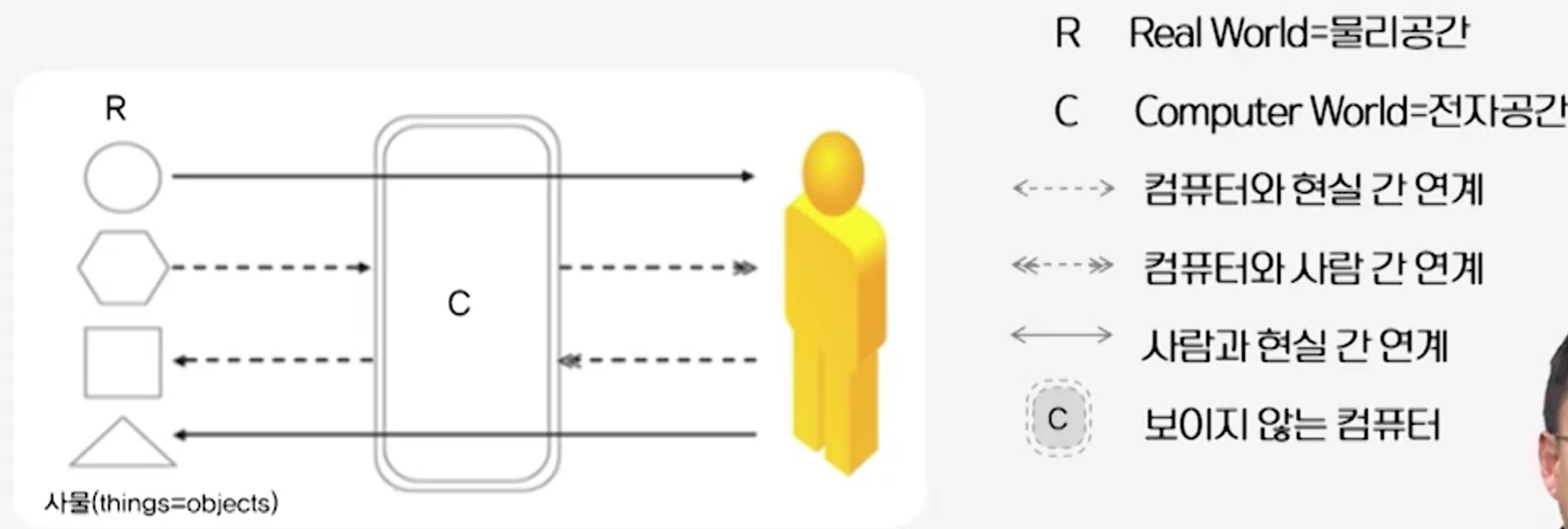- ์ฌ๋->์ปดํจํฐ->์ฌ๋ฌผ์ด ํ๋๋ก ์ฐ๊ฒฐ๋์ด ๊ธฐ๋ฅ์ ์ด๋ฉฐ ์ ๊ธฐ์ ์ผ๋ก ๊ฐ์ฅ ์ต์ ํ๋ ์ฆ๊ฐํ์ค ๊ณต๊ฐ์ ์งํฅํ๋ ๊ณต๊ฐํ๋ช