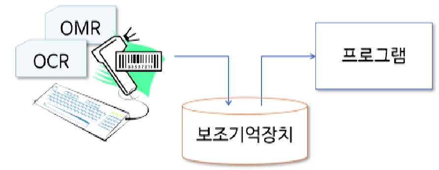 - ๋ฐ์ดํฐ๋ฅผ ์๊ธฐ๋์คํฌ๋ ๊ด๋์คํฌ, ํ๋์๋ฉ๋ชจ๋ฆฌ ๋ฑ์ ๋ณด์กฐ๊ธฐ์ต์ฅ์น์ ์ ์ฅํ ํ ์ด ๋ฐ์ดํฐ๋ฅผ ์ ๋ ฅ์ผ๋ก ์ฌ์ฉํจ.