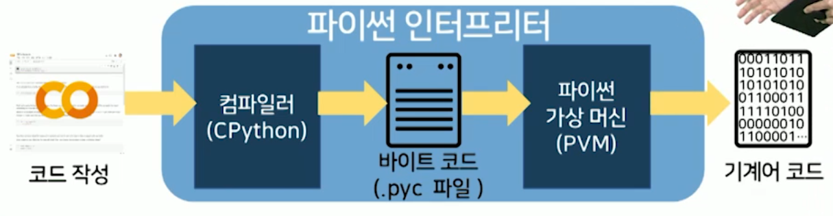 - ์ฝ๋ ์์ฑ -> CPython(์ปดํ์ผ๋ฌ) -> ๋ฐ์ดํธ์ฝ๋(.pyc ํ์ผ) -> ํ์ด์ฌ ๊ฐ์ ๋จธ์ (PVM)
