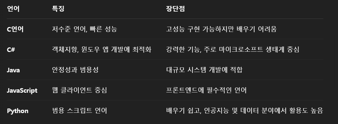 - 2025๋ ํ์ฌ์๋ 1์๋ฅผ ์ฐจ์งํ๊ณ ์๋ ์ธ๊ธฐ ๋ง์ ์ธ์ด์ด๋ค. ( C , Java , C# , C++ ๋ฑ ๋ค์ํ ์ธ๊ธฐ ์ธ์ด๋ค์ ์ด๊น )
