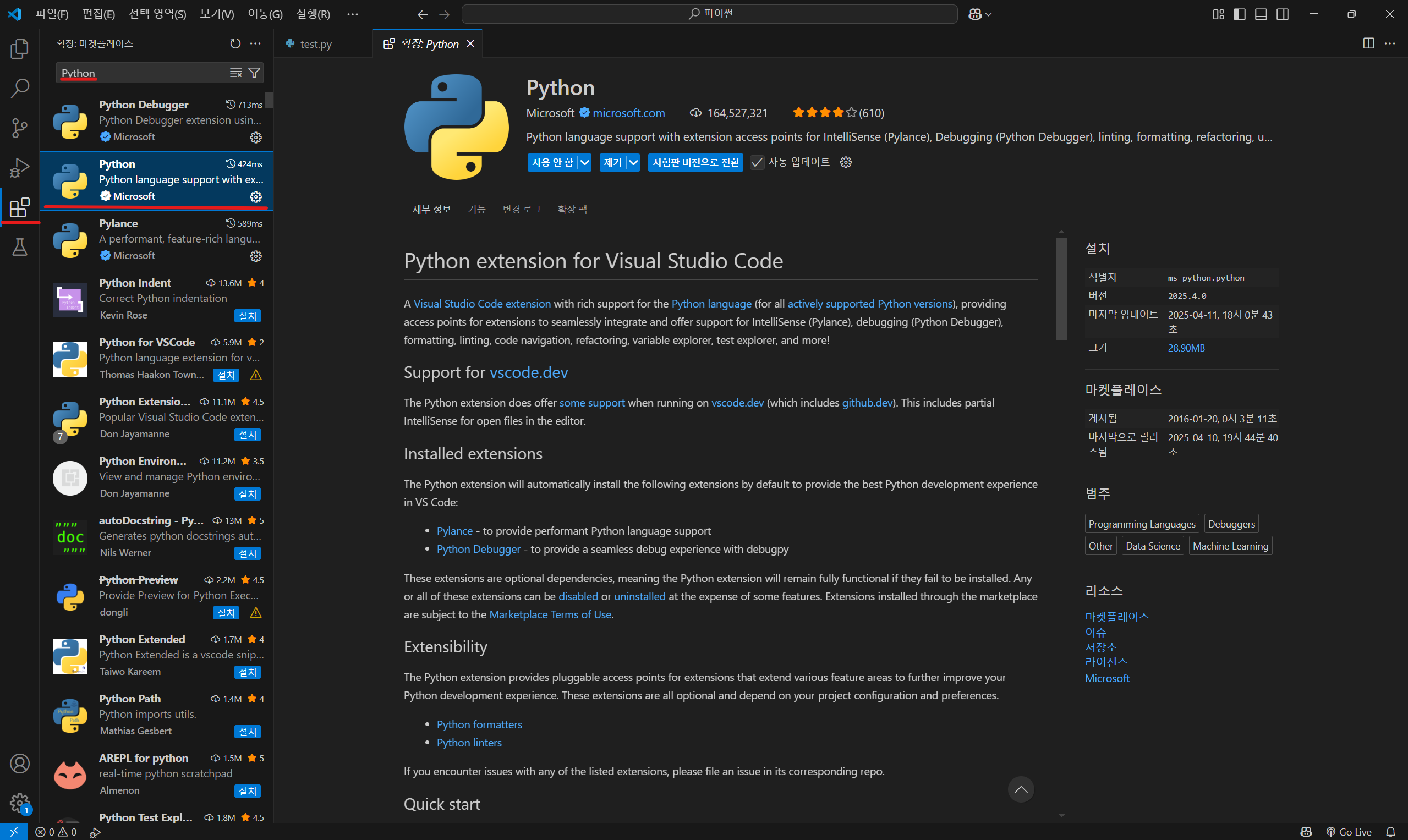 ์ผ์ชฝ ๋ฐ์ ํ๋ฌ๊ทธ์ธ์ ๋๋ฅด๊ณ Python์ ๊ฒ์ ํ ์ค์น๋ฅผ ์งํ ํด์ฃผ๋ฉด ๋๋ค.
