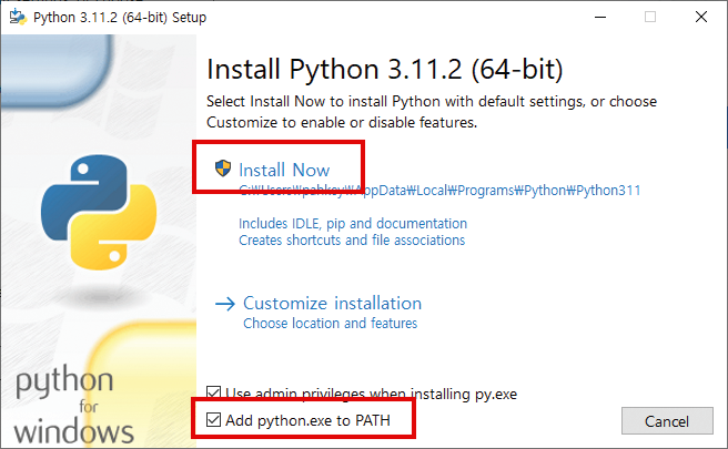 ์ฐธ๊ณ : Add python.exe to PATH ๋ PC๋ด ์ด๋์๋ ๋ช ๋ น์ด๋ก ์คํํ ์ ์๋๋ก ํ๊ฒฝ ๋ณ์์ ๋ฑ๋กํ๋ ๊ฒ์. ( ๋ฌด์กฐ๊ฑด ์ฒดํฌ ํ๋๊ฒ ์ข์. )