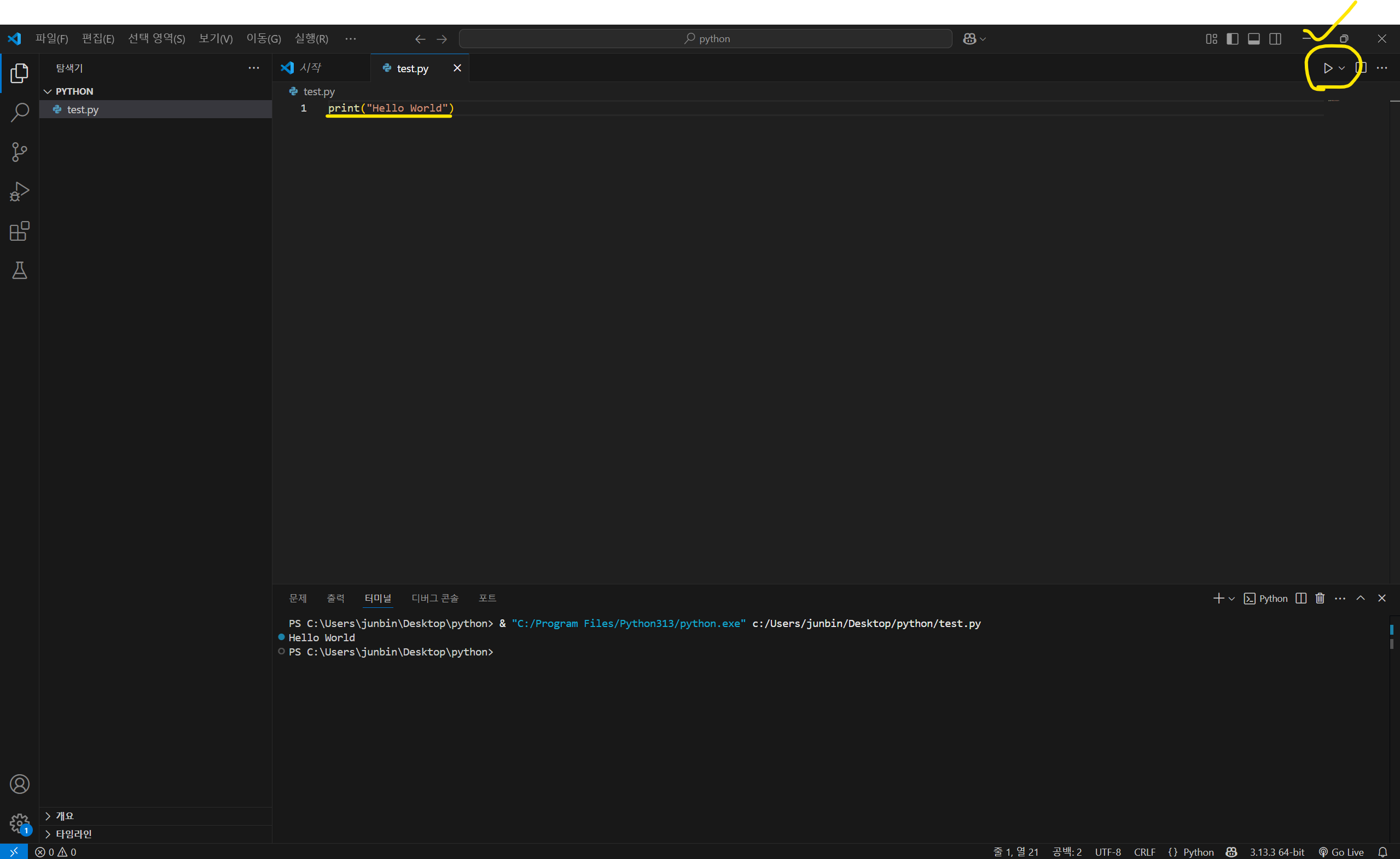 ํ๋ฌ๊ทธ์ธ์ด ์ค์น ๋ ํ ๊ธฐ์กด์ ๋ง๋ค์๋ ํ์ผ๋ก ๋์์์ ์๋์ ๊ฐ์ด print("Hello world")์ ๊ฐ์ ๊ธฐ๋ณธ์ ์ธ ํ๋ฆฐํธ ์ฝ๋๋ฅผ ์์ฑ ํ ์์ ์คํ ๋ฒํผ์ ๋๋ฅด๊ฒ ๋๋ฉด ๋งจ ์๋์ ํฐ๋ฏธ๋์ ๊ฒฐ๊ณผ๊ฐ์ด ๋์จ๋ค. ( ์ด์ ์๊ธฐ์ ์ฝ๋ ์์ฑํ๋ฉด ๋จ. )