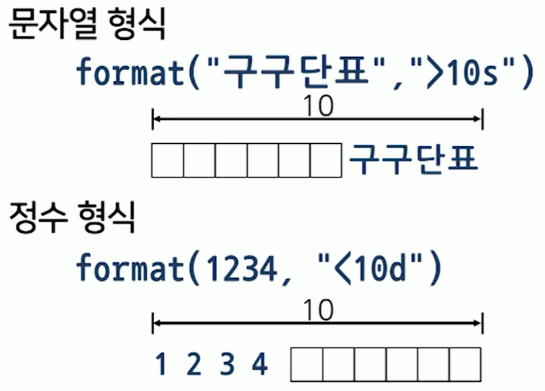 - ๋ฐ์ดํฐ๋ฅผ ์์์ ๋ง์ถฐ ํ์ํ ex) format("๊ตฌ๊ตฌ๋จํ", ">10s")