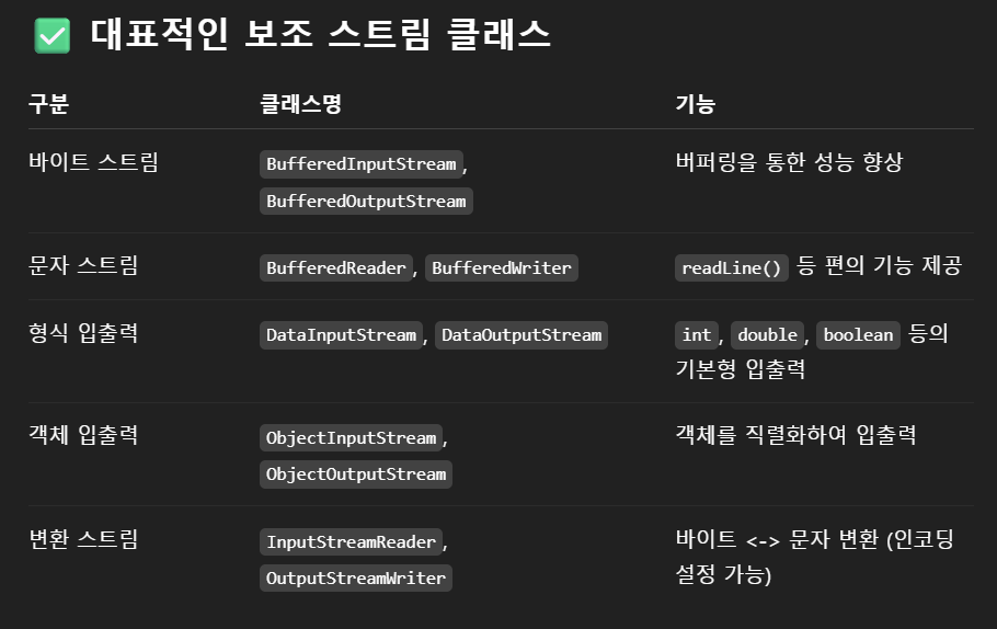 - ์ ์ถ๋ ฅ ๊ธฐ๋ฅ์ ๊ธฐ๋ณธ ์คํธ๋ฆผ์ด ํ์์์์ด๊ณ , ํด๋น ๊ธฐ๋ณธ ์คํธ๋ฆผ์ ์์ฑํ๊ณ ์ดํ ๋ณด์กฐ ์คํธ๋ฆผ์ ์์ฑํ๋ ๊ตฌ์กฐ์.
