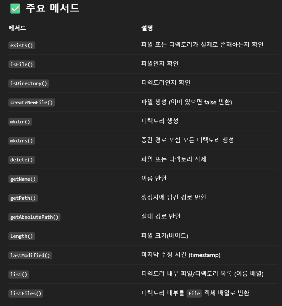 - java.io ํจํค์ง์ ์ํ๋ฉฐ, ํ์ผ๊ณผ ๋๋ ํ ๋ฆฌ๋ฅผ ์ถ์ํํด์ ๋ค๋ฃฐ ์ ์๋๋ก ํด์ฃผ๋ ํด๋์ค์ด๋ค.
