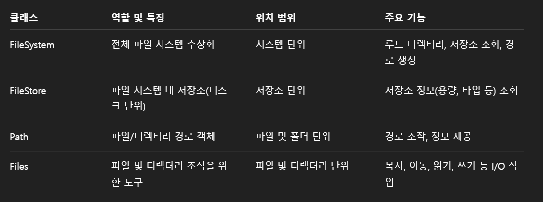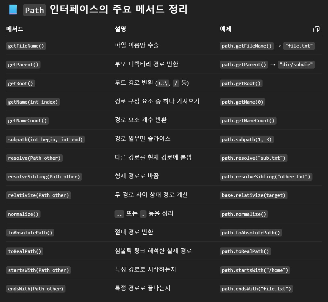- ์ฃผ์ ์ญํ : ๊ฒฝ๋ก(Path) ๊ฐ์ฒด ์์ฑ, ํ์ผ ์์คํ ์ ๋ฃจํธ ๋๋ ํ ๋ฆฌ ๋ชฉ๋ก ์กฐํ ๋ฑ์ด ์์.