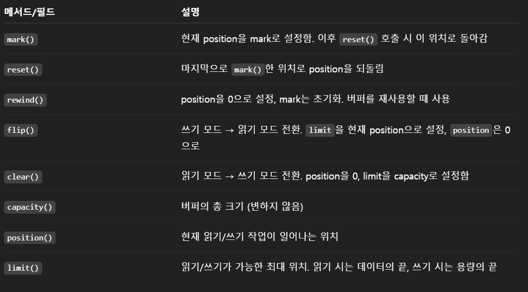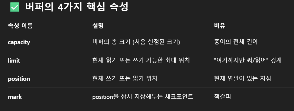 ByteBuffer buffer = ByteBuffer.allocate(1024); // ๋ฒํผ ์์ฑ