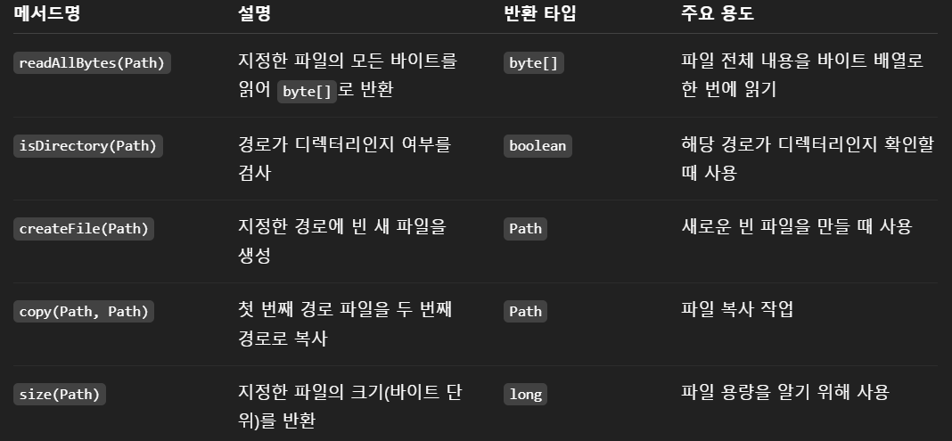 - ํด๋น Files ํด๋์ค์ Path ๊ฐ์ฒด์ ์ ๋ณด๋ฅผ ํ ๋๋ก ๊ฐ๋ฅํ ์์ ์. ์ฆ, Path ๊ฐ์ฒด๊ฐ ์ธ์๋ก ์ ๊ณต์ด ๋์ด์ผ ํจ.