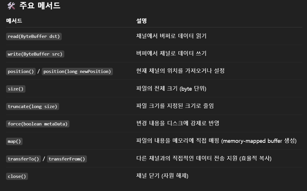 - ํ์ผ ์ ์ถ๋ ฅ ๋ชจ๋ ๊ฐ๋ฅํ FileChannel ํด๋์ค๊ฐ ์์ ( ๋ฒํผ๋ง ๊ธฐ๋ฅ, ๋ฉํฐ์ค๋ ๋์ ์์ ํจ )