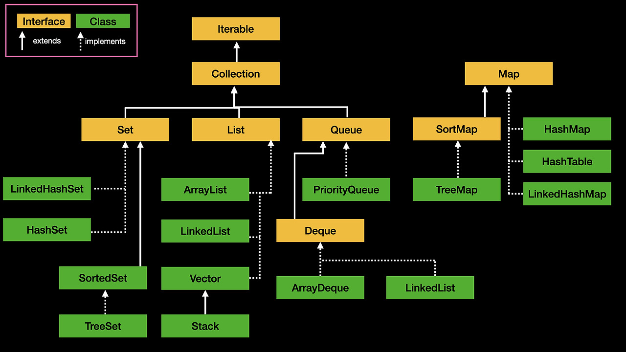 - ์ฆ, Collection ์ธํฐํ์ด์ค๋ง์ ์๋ฏธํ๋๊ฒ์ด ์๋ Map ๋ํ ์๋ฐ ์ปฌ๋ ์ ํ๋ ์์ํฌ๋ผ๊ณ ๋ณผ ์ ์์.