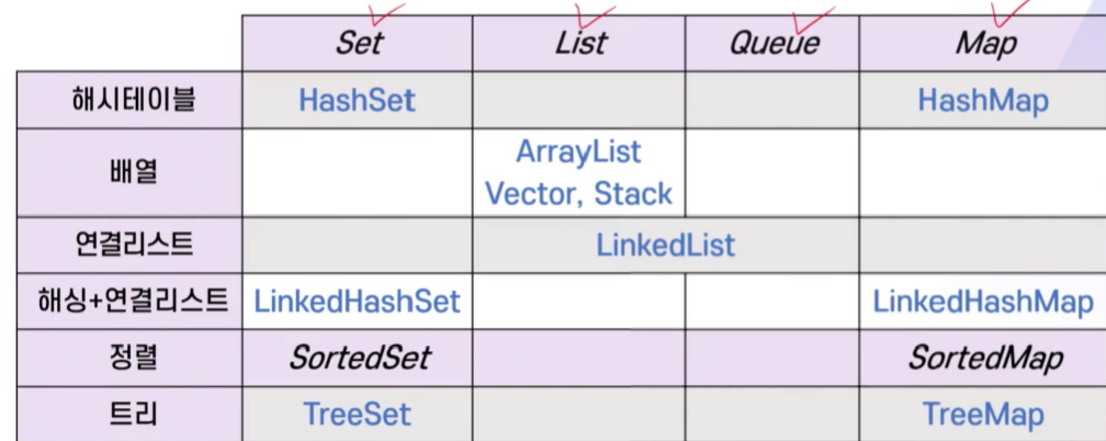 - ์ธํฐํ์ด์ค๋ Set, List, Queue, Map์ด ์์ผ๋ฉฐ, ๊ตฌํ ํด๋์ค๋ ๋ค์ํ๊ฒ ์์.