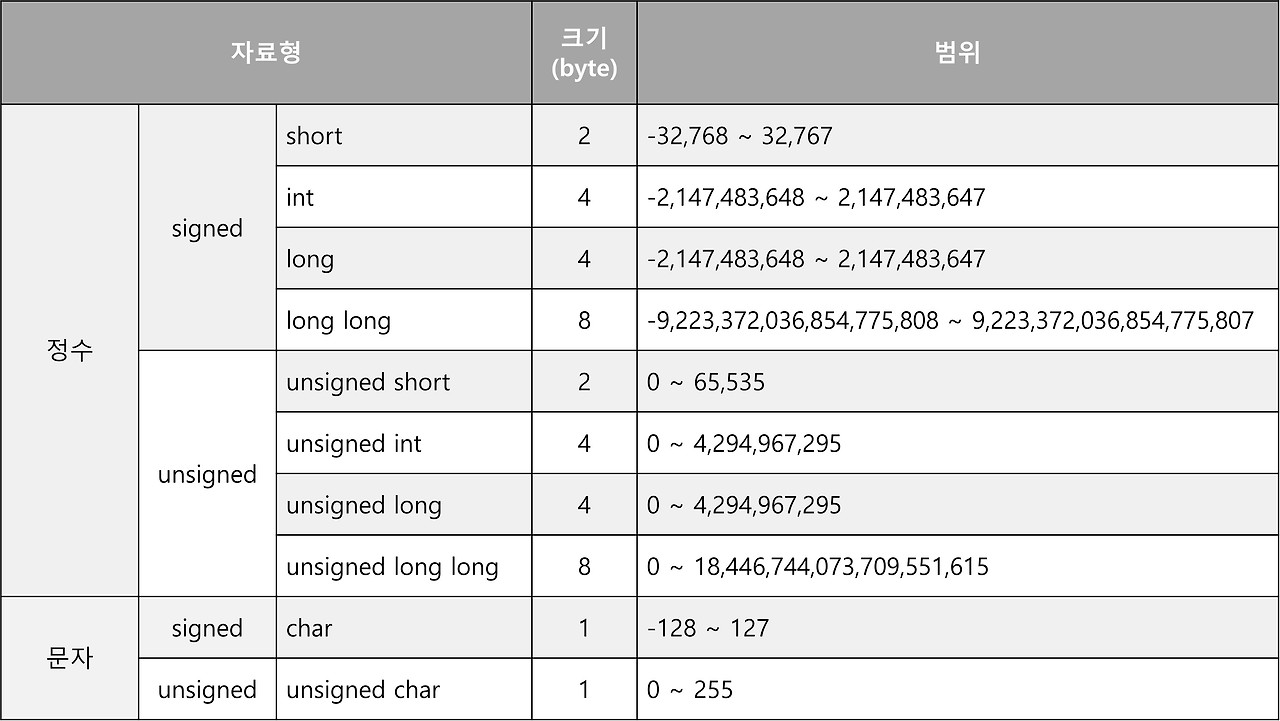 - signed: ๋ถํธ ์๋ ์ ์๋ก ์์์ ์์ ๋ชจ๋ ํํ์ด ๊ฐ๋ฅํจ. ( ๋ํดํธ๋ผ๊ณ ์๊ฐํ๋ฉด ๋จ. )