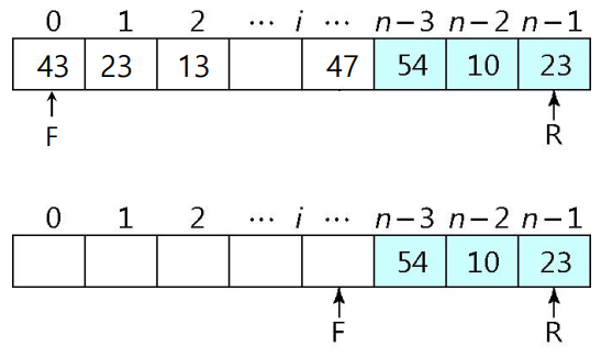 - λ°°μ΄λ‘ ꡬνλ νμμλ λ°μ΄ν°κ° νμ μ½μ λ¨μ λ°λΌ rear λ³μ κ°μ΄ μ¦κ°νλ€κ° n-1μ΄ λλ©΄ λ μ΄μ λ°μ΄ν°κ° μ½μ λ μ μλ μνκ° λ¨. μ¦, λ°°μ΄μ 곡κ°μ΄ ν λΉ λ°μ λ§νΌμ νμ λμ΄ μμ.