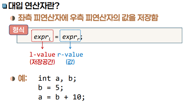 - μ’μΈ‘μ κ°(r-value) λ₯Ό μ°μΈ‘μ μ μ₯곡κ°(l-value) μ λ£λλ€. μ¦, = λ₯Ό ν΅ν΄μ λμ μ ν΄μ£Όλ μ°μ°μ μλ―Έν¨.