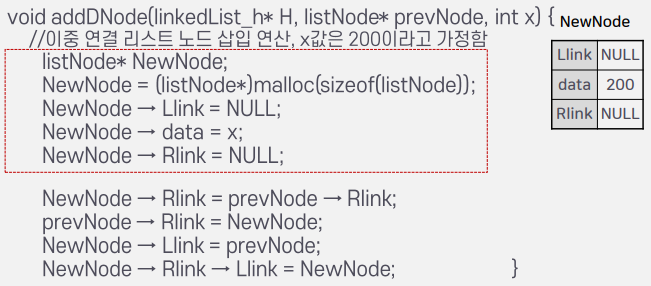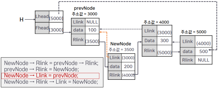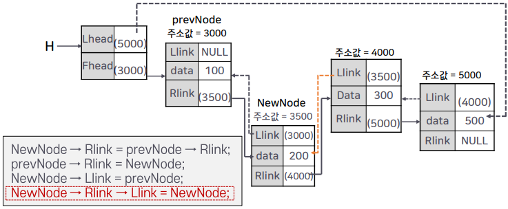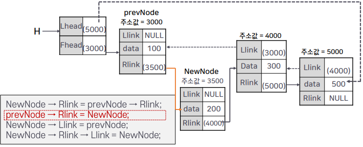 - ์ดํ, prevNode ์ Rlink ๋ถ๋ถ์ NewNode ๋ฅผ ๋ฃ๊ฒ ๋๋ฉด, NewNode ์ ์ฃผ์๊ฐ์ ๊ฐ์ง๋ ํํ๊ฐ ๋จ.