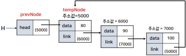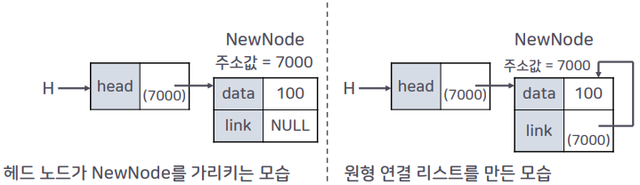 - ์ํ ์ฐ๊ฒฐ ๋ฆฌ์คํธ๊ฐ ๊ณต๋ฐฑ์ธ ๊ฒฝ์ฐ ์๋ก ๋ง๋ ๋ ธ๋์ ์ฃผ์๊ฐ์ head ์ ๋ฃ์ด์ฃผ๊ณ , ์๋ก ๋ง๋ค์ด์ง ๋ ธ๋์ link ์๋ ์๊ธฐ ์์ ์ ์ฃผ์๊ฐ์ ์ฐธ์กฐ๋ฅผ ํ๊ฒ ๋๋ค. ์ฆ, ์ํ ์ฐ๊ฒฐ ๋ฆฌ์คํธ์ ์ํ ๊ตฌ์กฐ๊ฐ ๋ง๋ค์ด์ง.