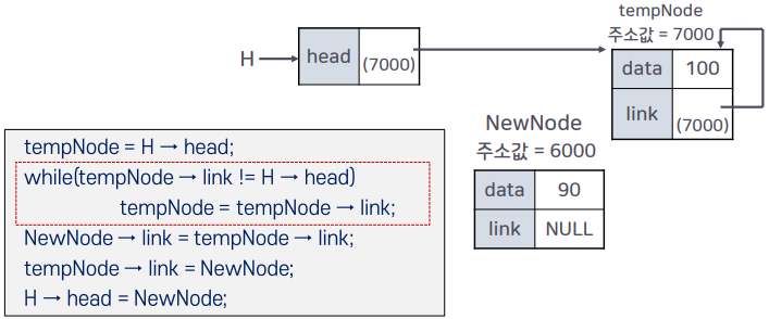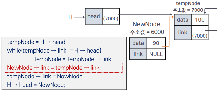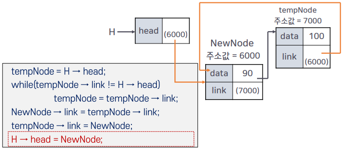 - ๋ํ, ์์ ์ด๋ฏธ์ง ์์์ ๋ง์ง๋ง ๋ถ๋ถ H -> head = NewNode ์ ๋ฃ์ผ๋ฏ๋ก ์ด ์์๋ head ์ ์๋ก ๋ง๋ค์ด์ง NewNode ๋ฅผ ๋ฃ๋ ๊ฒฝ์ฐ์ด๋ฏ๋ก, ์ํ ์ฐ๊ฒฐ ๋ฆฌ์คํธ์ ์ ์ผ ์ฒซ ๋ฒ์งธ ๋ถ๋ถ์ ๋ฃ๊ฒ ๋ค๋ ์๋ฏธ๋ฅผ ๊ฐ์ง๊ณ ์์.