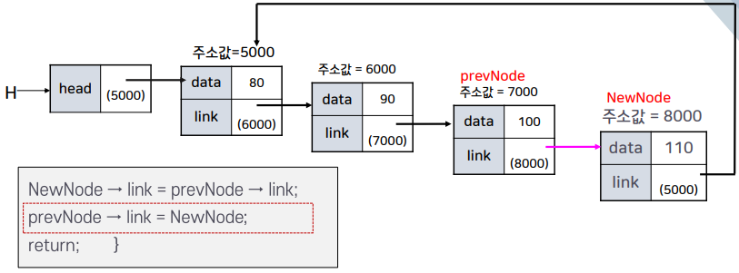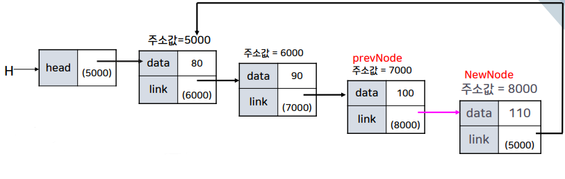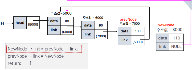- ์ฆ, prevNode ๊ฐ ๊ฐ๋ฆฌํค๋ ์ฃผ์๊ฐ 5000์ NewNode link ์ ๋ฃ์ด์ค์ผ๋ก์จ NewNode ๋ ๊ฐ์ด ๊ฐ๋ฆฌํค๋ ์ํฉ์ด ๋จ.
