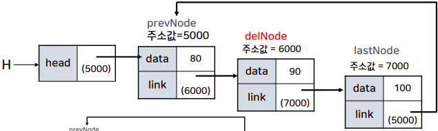 - ์ด๋ ๊ฒ ๋๋ฉด prevNode ์ delNode ๋ ๋ค lastNode ์ ์ฃผ์๊ฐ์ ์ฐธ์กฐํ๊ฒ ๋๋ค.