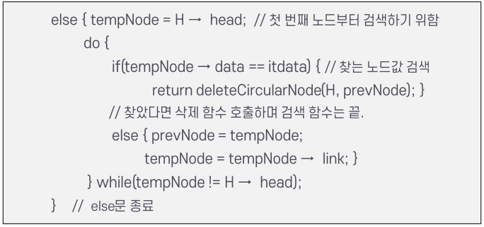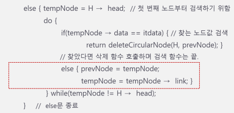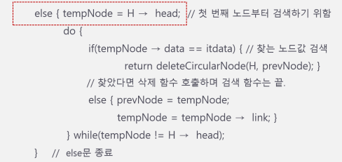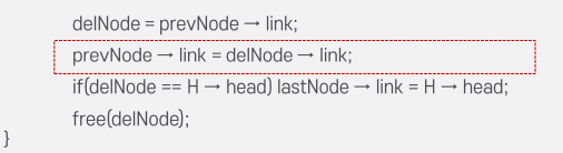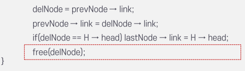 - ์ดํ, ์กฐ๊ฑด๋ฌธ์์ delNode == H -> head ์ธ ๊ฒฝ์ฐ๋ ์ญ์ ๋ ๋ ธ๋๊ฐ head ๊ฐ ๊ฐ๋ฆฌํค๋ ๋ ธ๋์ ์ฃผ์๊ฐ์ด ๋์ผ ํ ๊ฒฝ์ฐ lastNode ์ link ๊ฐ์ head ๊ฐ ์ฐธ์กฐํ๋ ์ฃผ์๊ฐ์ผ๋ก ๋ฃ๊ฒ ๋๋ค.