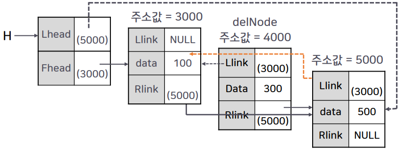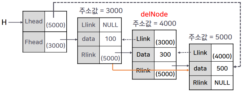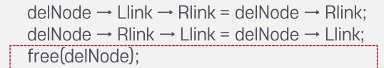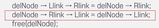 - ์ดํ, delNode -> Link -> Rlink = delNode ์ Llink ์ Rlink ๋ฅผ ์๋ฏธํ๋ฉฐ ๊ทธ ๊ณณ์ delNode ์ Rlink ๋ฅผ ๋ฃ๊ฒ ๋๋ค.
