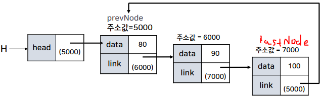 - H ๋ ์ํ ์ฐ๊ฒฐ ๋ฆฌ์คํธ์ head ์ ์ฃผ์๊ฐ์ ๊ฐ์ง๊ณ ์์ผ๋ฏ๋ก, prevNode ์ ๋ฃ์ด์ค์ผ๋ก์จ head ๋ฅผ ๊ฐ๋ฆฌํค๊ฒ ๋๋ค.