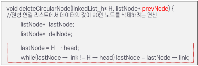 - deleteCircularNode() ํจ์์์๋ ๋จผ์ lastNode ํฌ์ธํฐ ๋ณ์๋ฅผ ๋ง๋ค์ด head ๊ฐ ๊ฐ๋ฆฌํค๋ ์ฃผ์๊ฐ๊ณผ lastNode ์ link ๊ฐ์ ๋น๊ตํ๋ฉด์ ๋ฐ๋ณต๋ฌธ์ ๋๊ฒ ๋๋ฉด, lastNode ๊ฐ ์ด๋ค ๋ ธ๋์ธ์ง ์ ์ ์๊ฒ ๋๋ค. ์ฆ, lastNode ์๋ ์ํ ์ฐ๊ฒฐ ๋ฆฌ์คํธ์ ๋ง์ง๋ง ๋ ธ๋๋ก ์ด๋์ ํ๊ฒ ๋๋ค. ์ดํ, ์ด๋ฌํ lastNode ๋ฅผ ํ์ฉํด์ ์ญ์ ๋ฅผ ์งํํ๊ฒ ๋๋ค.