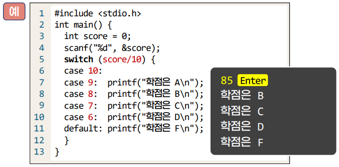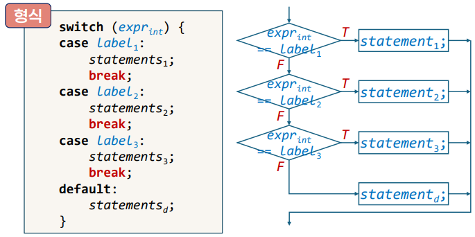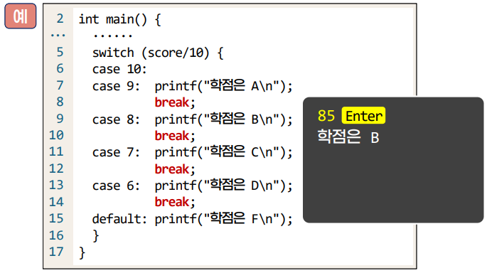 - break ๋ฌธ์ ํตํด ๋ค์์ ๋์ฌ case ๋ค์ ์ถ๋ ฅ์ ๋ง๊ณ ํด๋น case ๊ฐ ๋๋ ๋ break ๋ก ๋๊ฐ๊ฒ ๋จ.