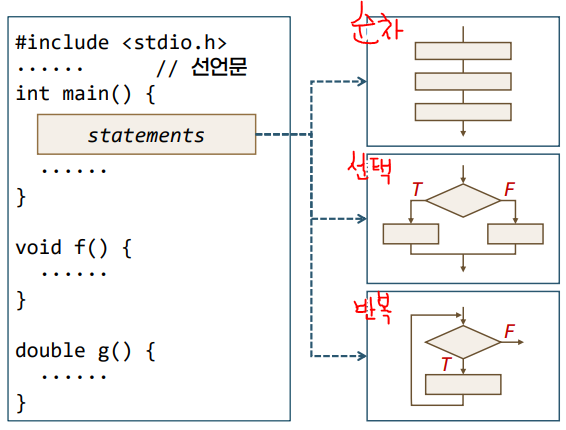 - ํ๋ก๊ทธ๋จ์ ์์ฑํ ๋ ์ผ๋ฐ์ ์ผ๋ก ์ฌ์ฉํ๋ ๊ฒ์ด ์์์๋ถํฐ ์ฐจ๋ก๋๋ก ์์ฐจ๊ตฌ์กฐ, ์ ํ๊ตฌ์กฐ, ๋ฐ๋ณต๊ตฌ์กฐ ์ด๋ค.