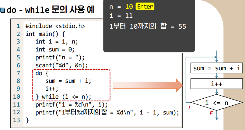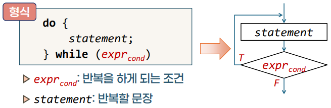 - ์ฆ, ๋ฐ๋ณต ์คํํ ๋ฌธ์ฅ์ ์ต์ 1ํ๋ ๋ฐ๋์ ์คํ์ ํ๊ฒ ๋๊ณ ์ดํ์ ์คํ ์กฐ๊ฑด์ ๊ฒ์ฌํ๊ฒ ๋๋ค.
