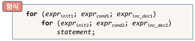 - for ๋ฌธ์ ๋ฐ๋ณต ์คํํ ๋ฌธ์ฅ์ด for ๋ฌธ์ด ํฌํจ๋ ๊ฒฝ์ฐ์ด๋ค. ( 2์ฐจ์ ๋ฃจํ๋ก ๋ณด๋ฉด ๋จ )