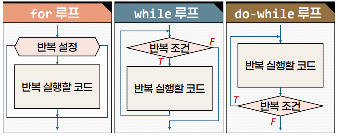 - for ๋ฃจํ, while ๋ฃจํ, do-while ๋ฃจํ ์ธ ๊ฐ์ง์ ๋ฐ๋ณต ์ ์ด๋ฌธ์ด ์์.