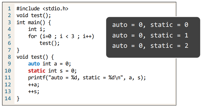 - ์ฆ, ๊ฒฐ๊ณผ๋ auto 0,0,0 static 0,1,2 ๊ฐ ๋์ค๊ฒ ๋๋ค.