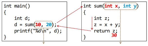 - ํจ์ ํธ์ถ: ์ฒ๋ฆฌ์ ํ์ํ ์๋ฃ๋ฅผ ํผํธ์ถ ํจ์์ ๋งค๊ฐ๋ณ์์ ์ ๋ฌํจ -> sum(10, 20);