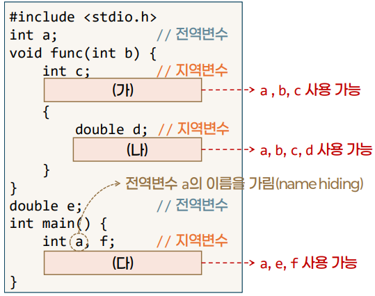 - ๋ธ๋ก์ด๋ ํจ์ ๋ด๋ถ์ ์ ์ธ๋ ๋ณ์, ํจ์ ํค๋์ ์ ์ธ๋ ํ์ ๋งค๊ฐ๋ณ์ ๋ํ ํฌํจ