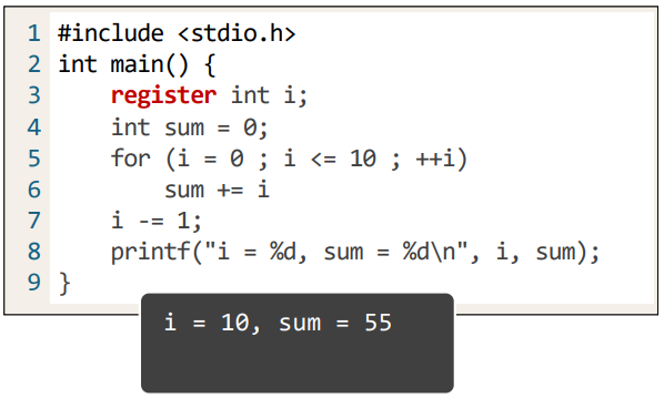 - ๋ ์ง์คํฐ ๋ณ์: CPU์ ๋ ์ง์คํฐ์ ์ ์ฅํ์ฌ ์ ๊ทผ ์๋๋ฅผ ์ต๋ํ ๋น ๋ฅด๊ฒ ํ๊ณ ์ ํ๋ ์ง์ญ ๋ณ์์.