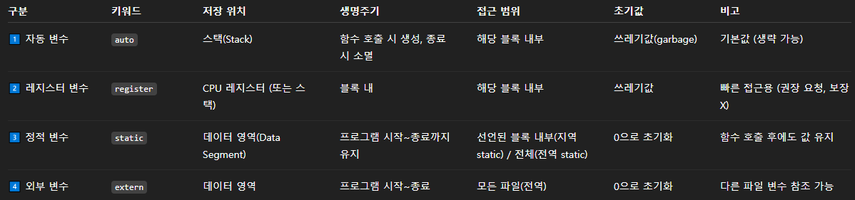 - C์ธ์ด์๋ ๋ํ์ ์ผ๋ก ์๋๋ณ์, ์ ์ ๋ณ์, ์ธ๋ถ๋ณ์, ๋ ์ง์คํฐ ๋ณ์ 4๊ฐ์ง ๊ธฐ์ต ํด๋์ค๊ฐ ์์.