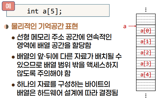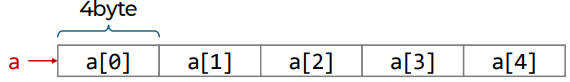 - int a[5]; ์ ์ธ์ ํ๊ฒ ๋๋ฉด, 5์นธ์ ๋ฐฐ์ด์ด ๋ง๋ค์ด์ง๋ฉฐ, ํ ์นธ์ ํฌ๊ธฐ๋ int 4byte ํฌ๊ธฐ๋ฅผ ๊ฐ์ง๋ ๋ฐฐ์ด์ด ๋ง๋ค์ด์ง๊ฒ ๋๋ค.