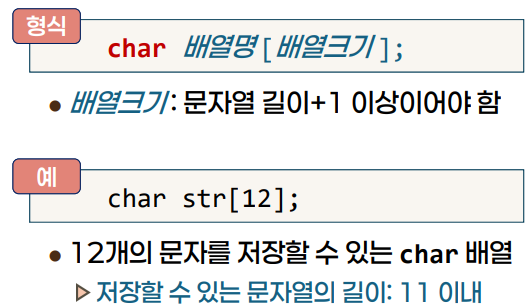 - ๊ธฐ์กด์ ๋ฐฐ์ด์ ๋ง๋๋ ๋ฐฉ๋ฒ๊ณผ ๋์ผํ๋ฉฐ, str[12]; ๋ก ๋ฐฐ์ด์ ๋ง๋ค๋ฉด 12์นธ์ ์ฐ๋ ๊ธฐ๊ฐ์ด ๋ค์ด๊ฐ ํํ๋ก ์ด๊ธฐํ๊ฐ ๋จ.