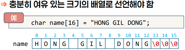 - ๋ฌธ์์ด์ ์ ์ฅํ ์ ์๋ ํฌ๊ธฐ์ ๋ง๊ฒ ๋ฐฐ์ด์ ์ ์ธํ๊ณ ํฌ๊ธฐ์ ๋ง๊ฒ ๋ฐฐ์ด์ ๊ฐ์ ๋ฃ์ด์ผ ํจ.