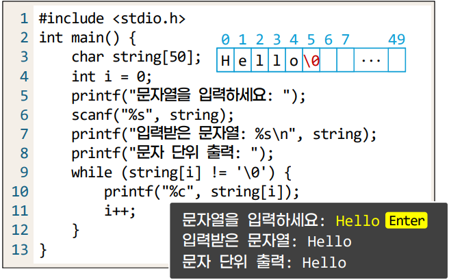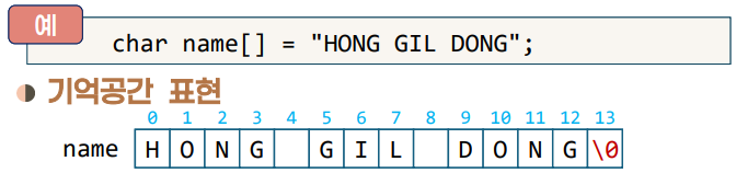 - C ์ธ์ด์์๋ ๋ฌธ์์ด์ ๋ค์์ ๋ฌธ์ํ(char) ์๋ฃ๋ฅผ ์ ์ฅํ๋ ๋ฐฐ์ด๋ก ํํ์ ํจ.