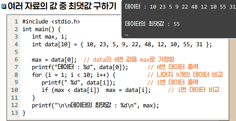 - ์์ ๊ฐ์ด ์๋ฃ์ ์ต๋๊ฐ์ ๊ตฌํ๋ ์์๊ฐ ์๋ค๊ณ ๊ฐ์ ํ๋ฉด, ๋ณ์๋ง ๊ฐ์ง๊ณ ๋ฐ์ดํฐ๋ฅผ ์ ์ฅ ํ ๊ฒฝ์ฐ ์ต๋๊ฐ์ ์ฐพ์ ๋ ์์ ๊ฐ์ด ํ๋์ฉ ์ ์ฒด๋ฅผ ๋น๊ตํด์ผ ํ๋ค. ์ด๋ฌํ ๊ณผ์ ์ ๋งค์ฐ ๋นํจ์จ์ ์. ๊ทธ๋์ ๋ฐฐ์ด์ ์ฌ์ฉํจ.