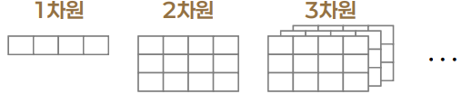 - ๋ฐฐ์ด์ ์ฐจ์: ๋ฐฐ์ด์ ์์๊ฐ ๋์ด๋๋ ๊ตฌ์กฐ์ด๋ฉฐ, 1์ฐจ์, 2์ฐจ์, 3์ฐจ์ ... ๋ฑ์ด ์์.