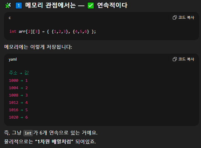 - ๋ชจ๋ ์ฐจ์ ๋ฐฐ์ด์ ์์ ๊ฐ์ด ๋ฉ๋ชจ๋ฆฌ ๊ด์ ์์๋ ์ฐ์์ ์ผ๋ก ์ ์ฅ์ด ๋๋ค.