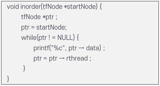 - (2) tfNode* ptr = inorderStart(root): inorderStart() ν¨μ νΈμΆ λ§€κ°λ³μλ‘ root μ£Όμ μ λ¬
