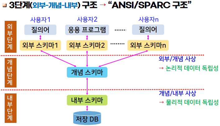 - 1975๋ ๋ฏธ๊ตญ ํ์ค ํํ ANSI์ SPARC ์์ํ์ ์ ์์ผ๋ก ๋ฐ์ดํฐ๋ฒ ์ด์ค ์ํคํ ์ฒ(3๋จ๊ณ ์คํค๋ง ๊ตฌ์กฐ)๋ก ๋ฐ์ดํฐ๋ฒ ์ด์ค ์์คํ ์ ์ธ ๊ฐ์ง ๊ด์ (์ธ๋ถ, ๊ฐ๋ , ๋ด๋ถ)๋ก ๋๋์ด ์ ์ํ ๋ชจ๋ธ์.